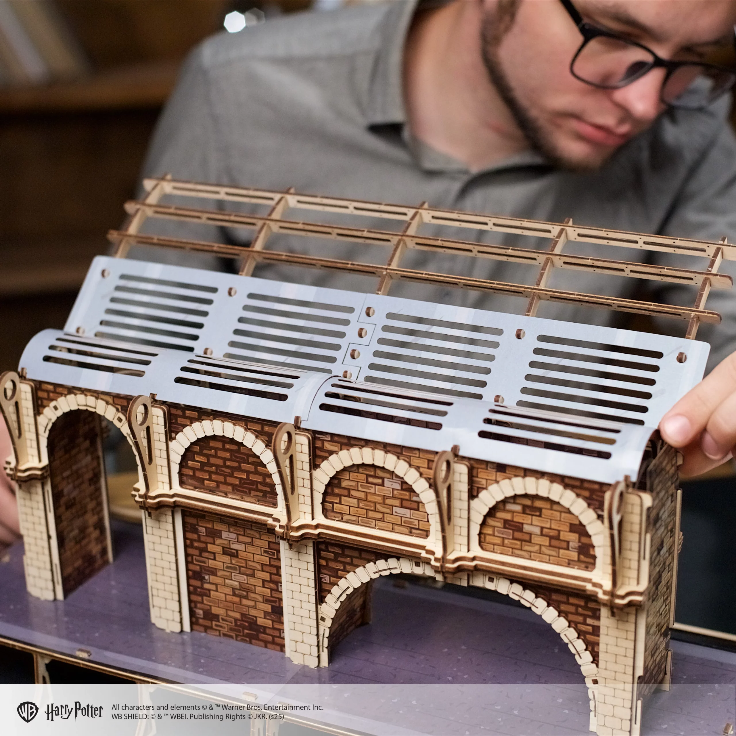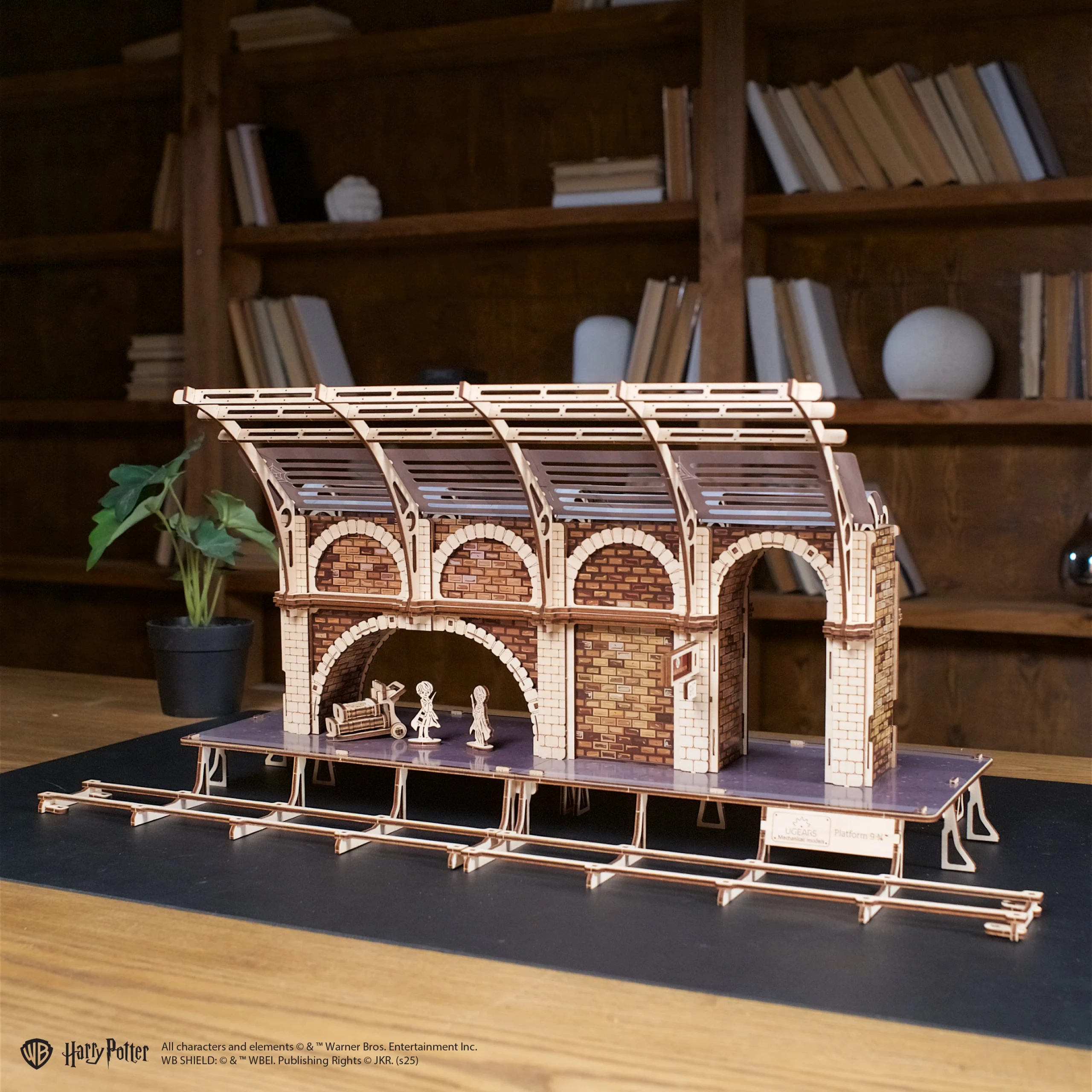 La féerique maquette en bois Quai 9 ¾ de Ugears est un nouvel ajout à la collection Harry Potter™ de Ugears (qui comprend également des maquettes mécaniques en bois à monter soi-même du Hogwarts™ Express, de la Voiture volante Ford Anglia™, du Magicobus™, de la Moto Volante de Hagrid™ et du Calendrier de l’Avent). Cette jolie maquette de quai de train est une présentation statique qui reproduit l’aspect de l’époque victorienne de la gare de King’s Cross, avec ses superbes briques et son plafond en arche. La maquette comprend un quai à deux côtés avec des arches incurvées vers le haut, un panneau de quai, une section de voie ferrée et deux figurines de Harry et Ron avec un chariot à bagages et des valises chargées de leurs affaires scolaires. Des murs décoratifs détaillés en carton complètent l’aspect réaliste de la gare historique avec des touches de mystère sombre, comme une toile d’araignée et un rat (Scabbers – c’est vous ?).
