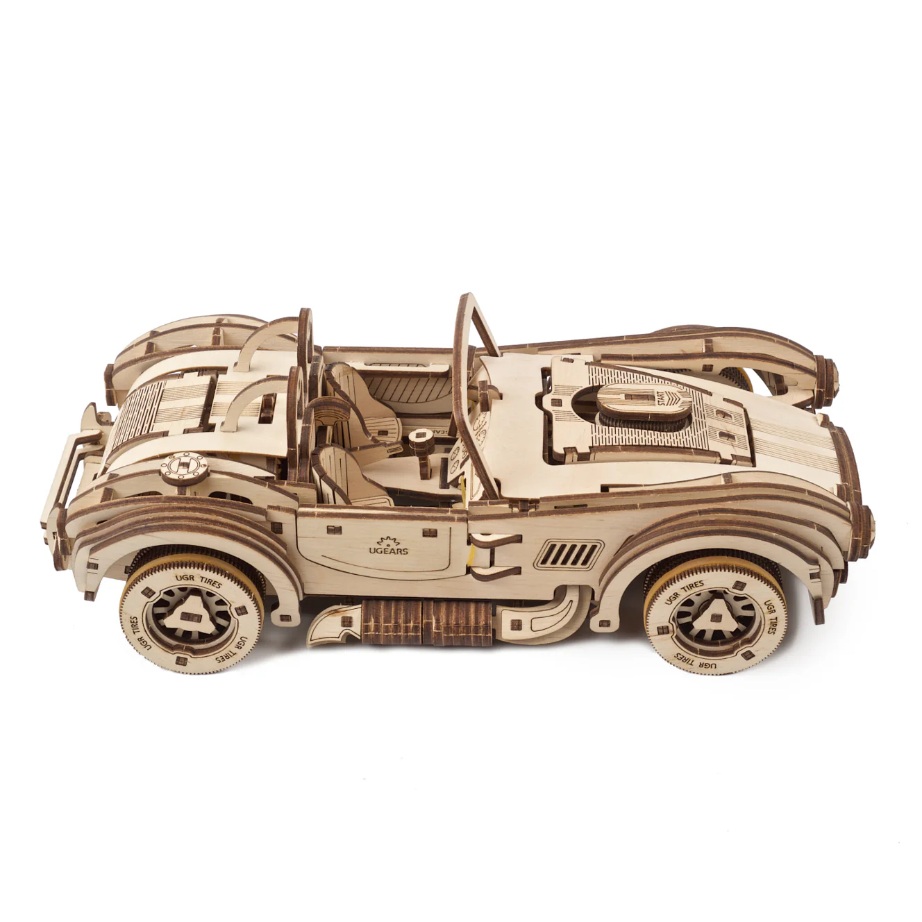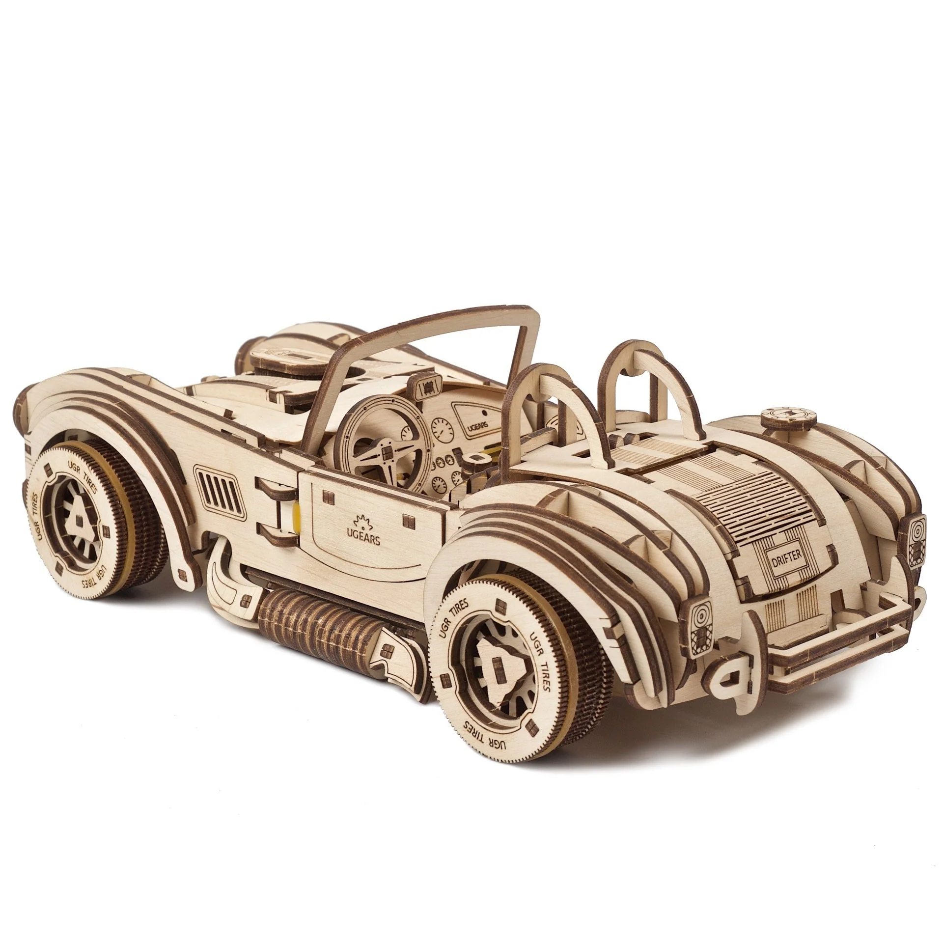 Nous savons que vous êtes fans de modélisme automobile et que vous adorez les modèles Cabriolet, Roadster et Bolide U-9 ! Bonne nouvelle : vous allez devoir faire un peu de place sur votre étagère, car un nouveau modèle mécanique très performant vient de faire son entrée dans la collection Ugears. Nous vous présentons la Voiture de course Drift Cobra, un cabriolet deux places aux lignes élégantes, inspiré de la voiture de sport la plus célèbre de tous les temps : la Shelby Cobra 427. La Cobra 427, produite entre 1965 et 1967, était équipée d’un moteur de 7 litres développant 450 à 510 chevaux. Elle atteignait le 0 à 100 km/h en un peu plus de 4 secondes et sa vitesse maximale était de 260 km/h.