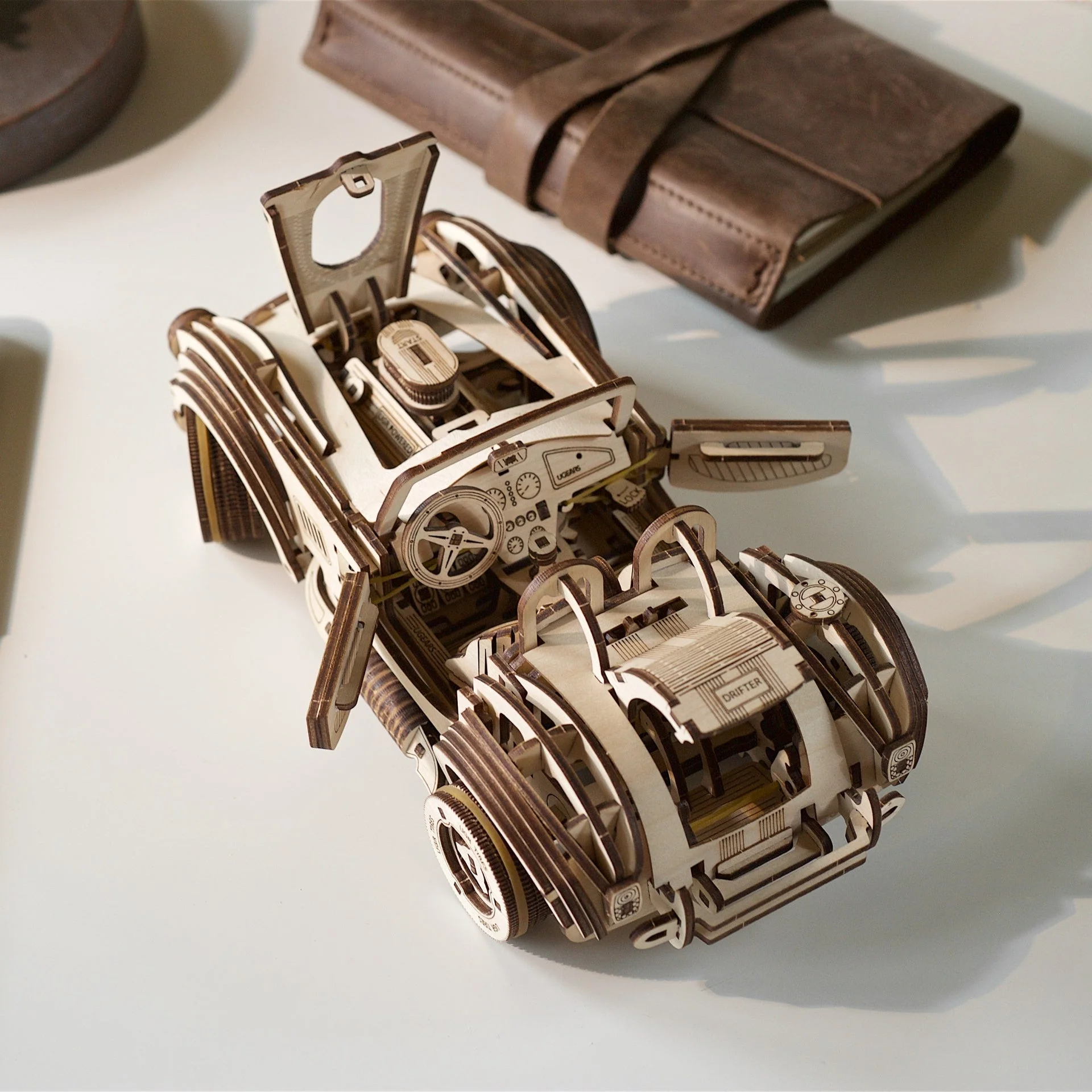 Pour nous, ce puzzle 3D à monter soi-même est une vraie petite merveille, avec ses larges pneus, ses lignes galbées (grâce à des pièces découpées avec précision au laser dans du contreplaqué de 1 mm), sa calandre rugissante et son élégance innée. Cette voiture en bois comprend des roues avant qui tournent, des portes qui s’ouvrent, ainsi qu’un capot et un coffre pouvant être relevés. À la place d’un moteur à élastique traditionnel, nous avons opté pour un puissant mécanisme à ressort qui donne de la puissance à ce bolide et qui présente de plus l’avantage de prolonger la durée de vie du modèle. Le mécanisme à cliquet vous évite de devoir tenir le bouton pendant toute la durée de l’enroulement – l’énergie potentielle est stockée à chaque rotation, sans glissement, jusqu’à ce que le puissant ressort interne soit complètement tendu.