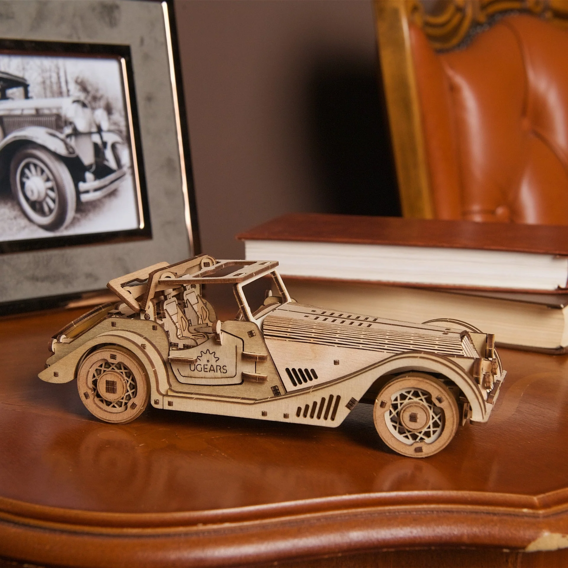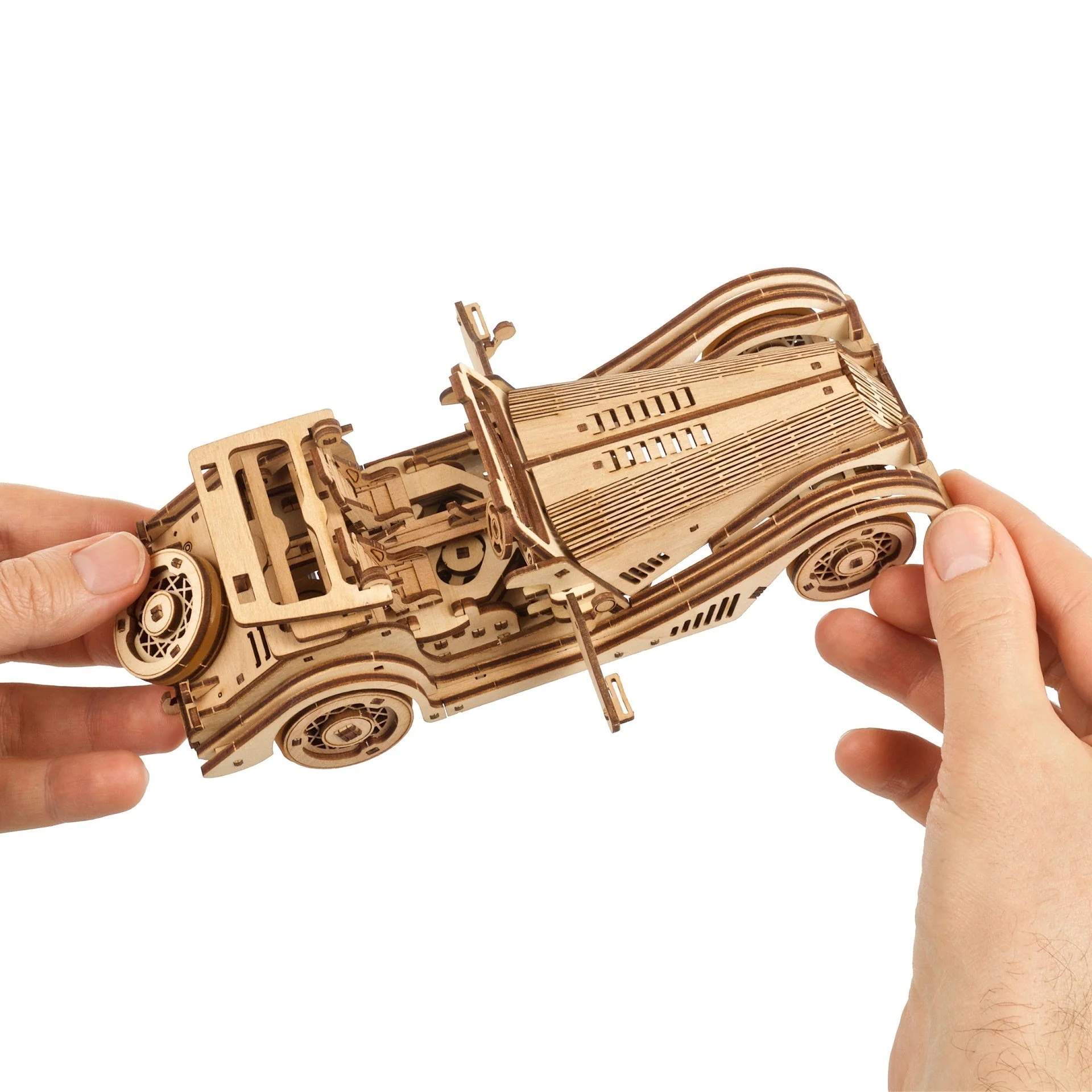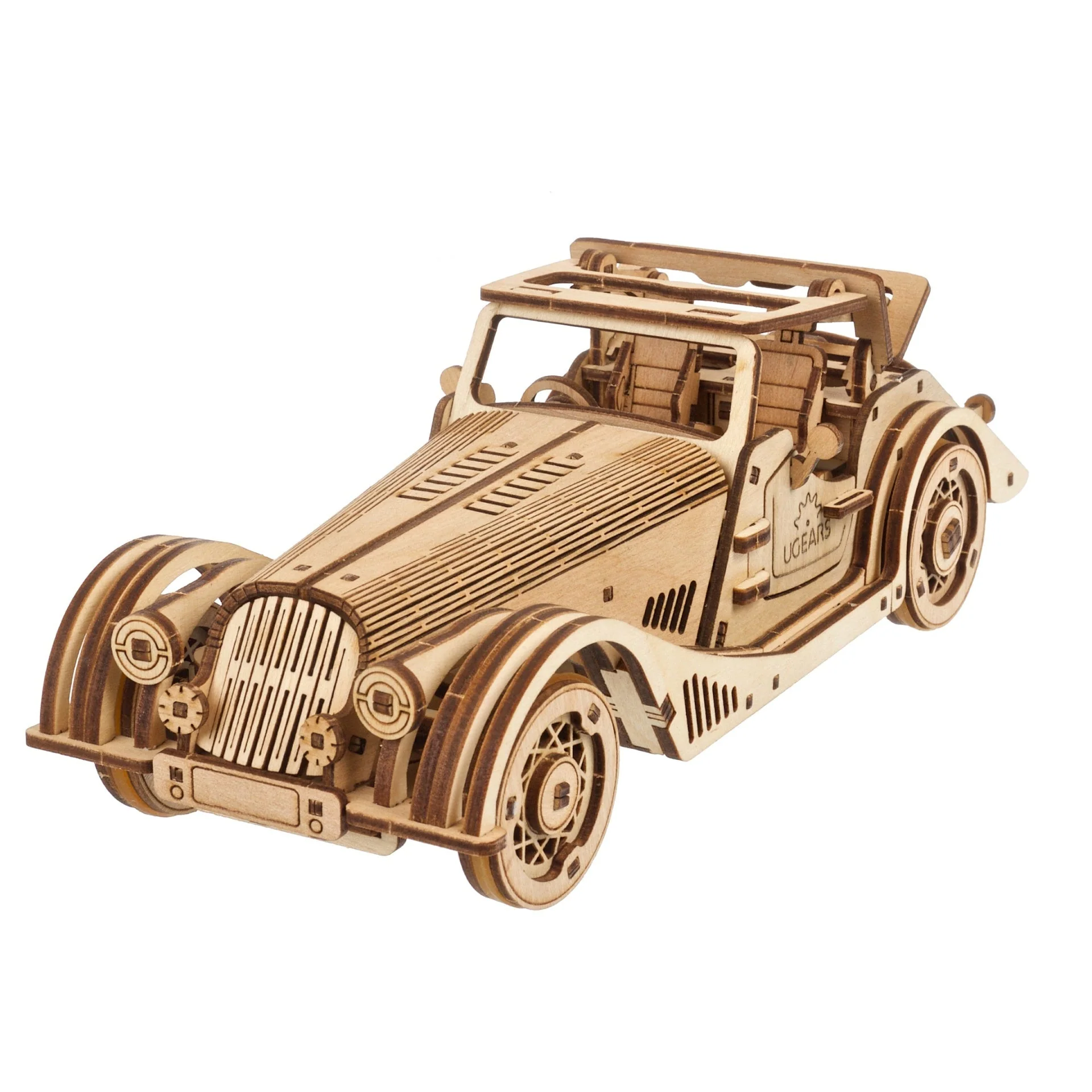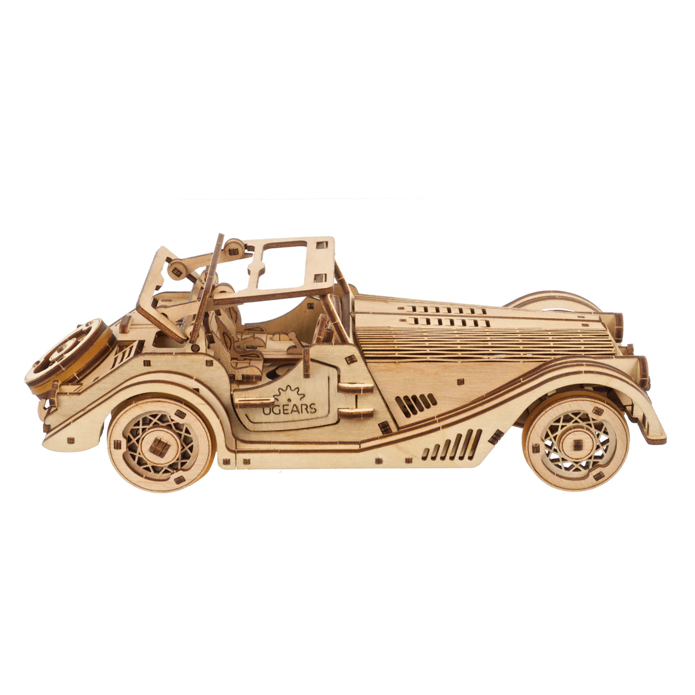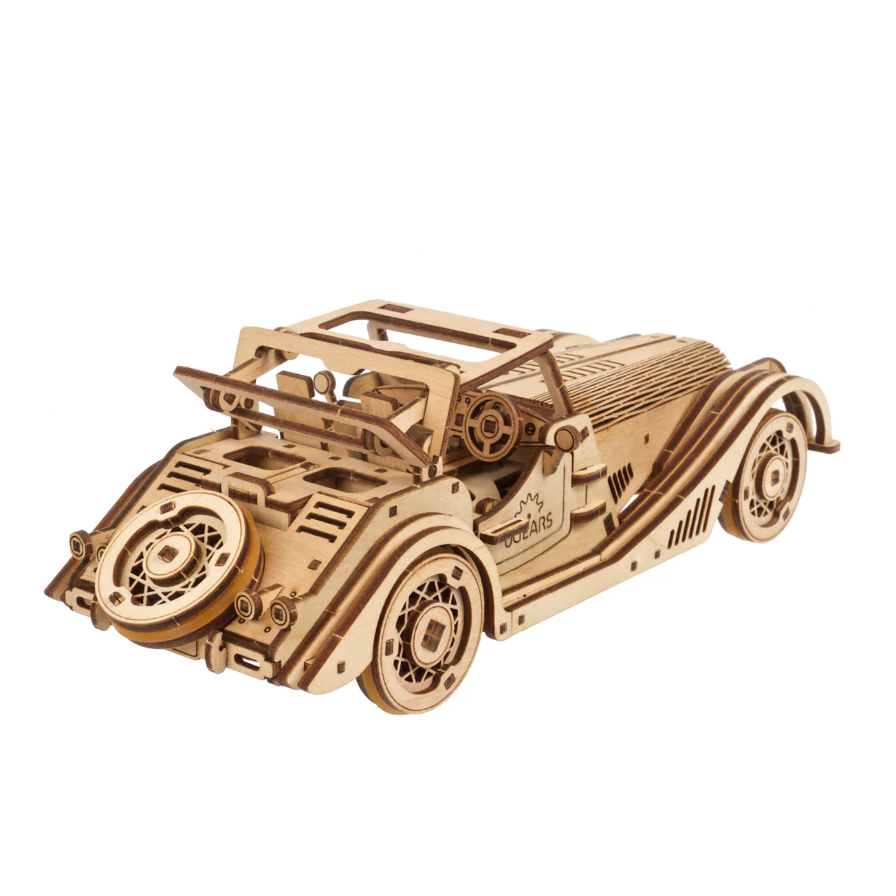 La maquette de mini Voiture de sport possède un moteur. Remontez le moteur à ressort en effectuant six rotations complètes de la clé à cliquet située sur le châssis de la petite voiture, ou tirez la Voiture de sport vers l’arrière sur une surface plane, relâchez-la et regardez-la partir à toute vitesse, comme n’importe quelle voiture-jouet à tirer. Ce modèle réduit de voiture en bois peut tourner à gauche ou à droite en ajustant les roues avant, ou se diriger en ligne droite et prendre de la distance. Les pneus en élastique donnent de la traction et sont faciles à monter et à remplacer. La maquette Ugears Voiture de sport “Souris Rapide” dispose d’une échelle réaliste, d’un intérieur merveilleusement détaillé, d’une roue de secours fonctionnelle montée sur le coffre qui peut être interchangée avec l’une ou l’autre des roues avant, de portes latérales qui s’ouvrent et d’un toit rigide manuel avec toit ouvrant qui se replie, s’abaisse et se referme par enclenchement.