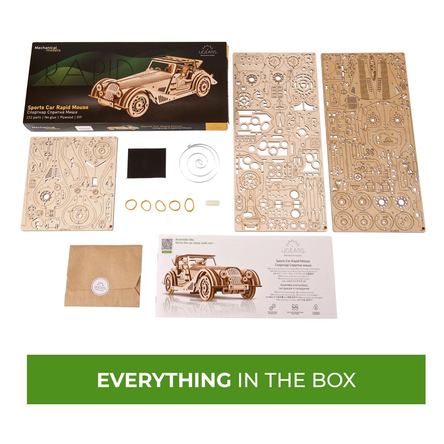 Le kit de mini Voiture de sport “Souris Rapide” à monter soi-même comprend 226 pièces et est classé au niveau “Facile”. Tout ce dont vous avez besoin pour l’assemblage est inclus dans la boîte. Il suffit de détacher les pièces des planches prédécoupées au laser et de les assembler en suivant nos instructions illustrées étape par étape en 11 langues (anglais, ukrainien, allemand, espagnol, français, italien, portugais, polonais, japonais, chinois et coréen). Profitez de 4 heures de construction légèrement ambitieuse, puis de plusieurs heures de jeu avec votre maquette de voiture miniature. Et si vous appréciez cette mini-voiture de sport classique, découvrez les autres modèles de la gamme exceptionnelle de puzzles 3D, de kits de modèles réduits, d’automates, de robots, de boîtes puzzle en bois et de kits de modélisme STEM Lab Ugears.